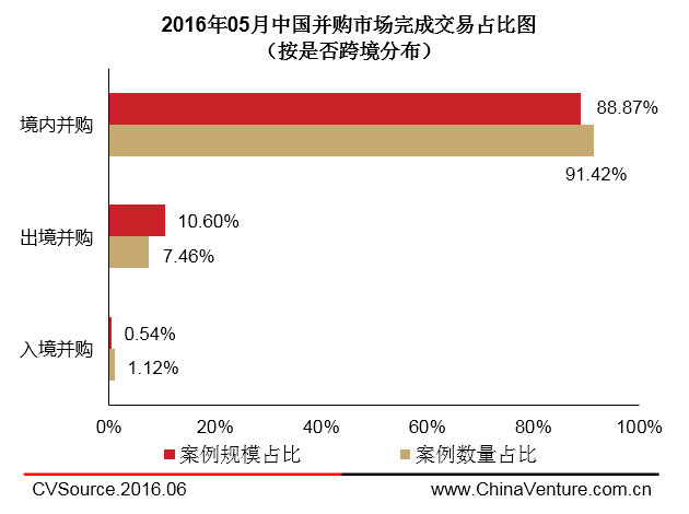 根据CVSource投中数据终端显示,2016年5月,中国并购市场已完成交易案例共268起,披露并购交易金额约163.15亿美元,其中境内并购245起,交易规模约为144.99亿美元,数量及金额分别占比为91.42%、88.87%;出境并购20起,交易规模约为17.29亿美元,数量及金额分别占比为7.46%、10.60%;入境并购3起,交易规模约为0.88亿美元,数量及金额分别占比为1.12%、0.54%(见图5)。