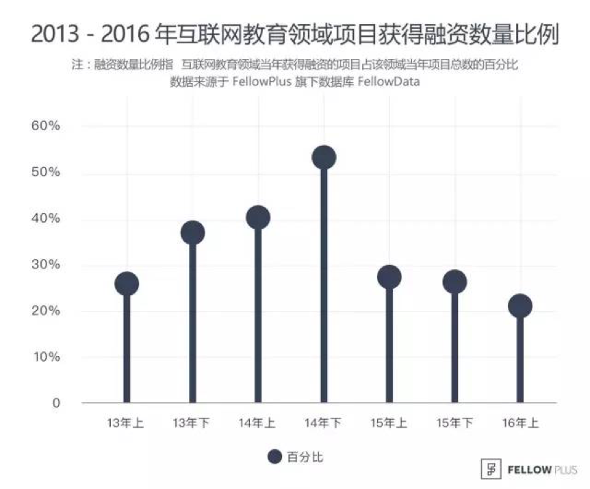 较创业数量相比,教育行业获得融资的项目比例从 2013 年到 2014 年下半年呈上升趋势,而从 2015 年上半年开始下降,整体的平均获投比例约为三分之一。