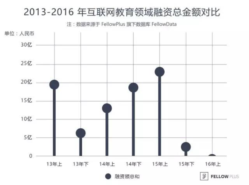 2015 年上半年中国教育领域的融资额已经接近 24 亿人民币,增长幅度接近 20%,但是下半年却下降了近 87% 。