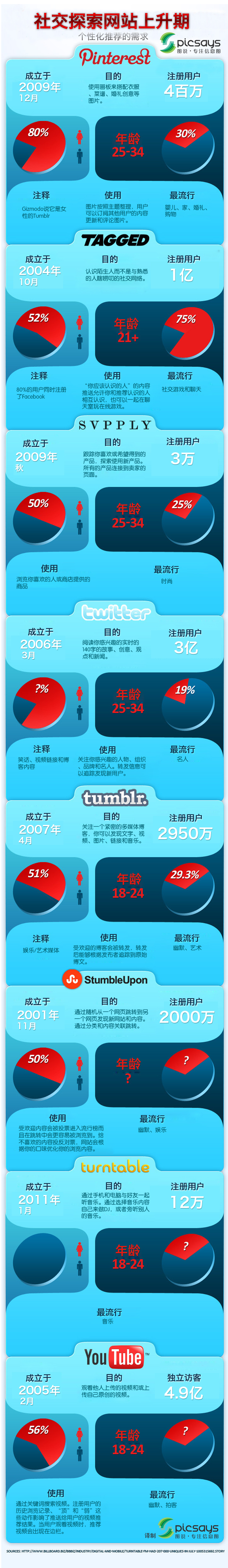 社交探索网站上升期–数据信息图 本幅信息图介绍了国外最流行的几个社会化网站,Pinterest,Tagged,Svpply,Twitter等等。当然国人对于这些网站也不陌生。社交网站仍然处于发展的上升期,还有很大的发展潜力。这是一个互联的世界,我们脱离不了社会化的浪潮。 更多阅读:五大社交网站用户横向对比–数据信息图社交网站知道你上网都干了些什么?–数据信息图BBC :各界对于未来150 年的预测–数据信息图eMarketer:社交新秀崛起 为品牌提供更多营销机会GlobalWebIndex:2012年全球社交网站活跃用户排名Eloqua:研究显示Pinterest与Twitter相比其发送的推介流量是后者的两倍Shareaholic:2012年6月社交图片分享网站Pinterest推荐流量超TwittercomScore:2011年8月美国移动社交网站用户访问数据EyeTrackShop:国外社交网站个人首页(Profile Page)眼动热点图研究每日电讯报:社交媒体取代电视成英国青少年首选娱乐方式社交网络公司信息图之一:Facebook帝国CoSchedule:社交媒体最佳发布时间BlueRun Venture:兴趣图谱将改变社交网络及未来的商业Compete:社交网络间相互连接的媒体生态链CNBC:Pinterest成美第三大社交网站 刺激小企业销量