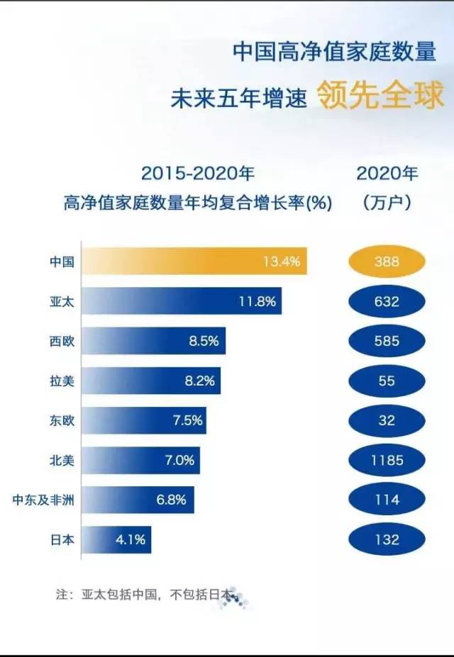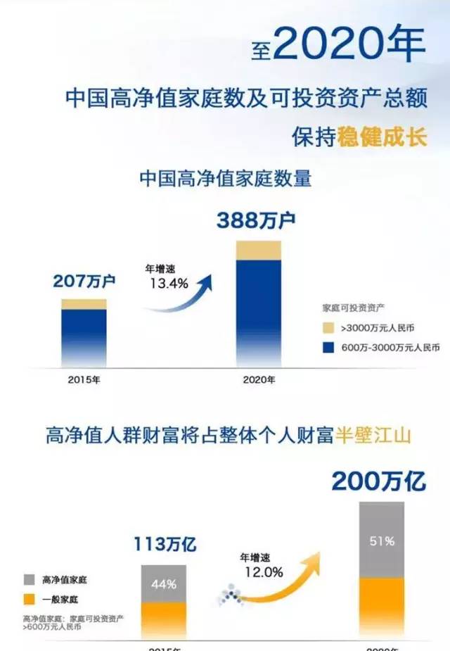 报告指出,在中国经济增速趋缓的背景下,高净值人群的财富增长仍将十分稳健,预计2020年中国高净值家庭的数量将增至388万户,可投资金融资产总额将占据中国整体个人财富的半壁江山,这将为中国私人银行业务提供良好的发展土壤。