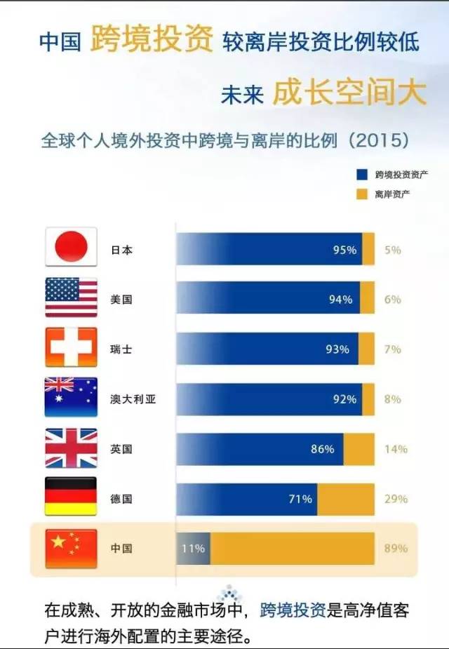 调研显示,目前中国个人境外资产配置比例远低于其他国家,但随着私人财富全球化进程的深化,估计到2020年中国个人境外资产配置比例将从目前的4.8%上升到9.4%左右,新增市场规模将达到13万亿元人民币。而来自监管和需求两方面的趋势性转变,是境外投资市场快速增长的一项重要推动力。