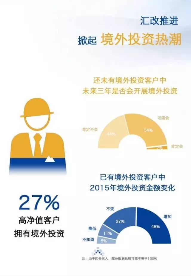 报告分析认为,2015年中国金融和投资市场的剧烈波动,使得中国高净值客户投资更加多元化,尤其是随着中国经济全球化持续深入,高净值人群资产全球配置的需求显著上升,未来五年中国个人境外资产配置比例将从目前的4.8%上升到9.4%左右,新增市场规模将达到13万亿元人民币。