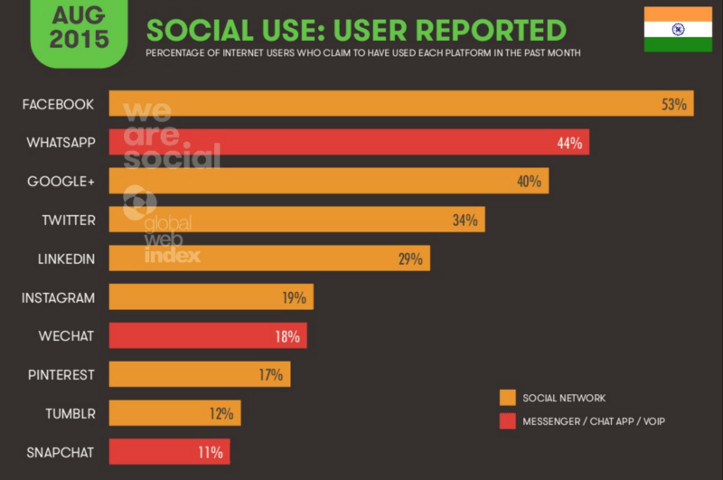 《2015年 印度互联网报告》指出,72%的社交媒体用户通过移动端登陆,而且印度社交媒体用户平均年龄要比全球用户平均年龄年轻,一半的印度互联网用户在 23 岁,甚至更年轻。