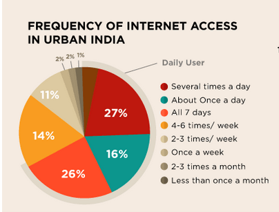 此外,印度网民平均每天上网时间 5.1 小时。城市互联网用户中,69%的网民几乎每天都上网。