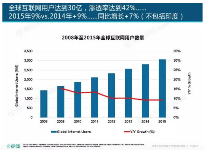 根据美国最大风险投资基金 KPCB 近期发布的《互联网趋势》报告(互联网女皇报告)显示,目前全球互联网用户已经达到 30 亿。与此同时,虽然渗透率(互联网用户在总人口中的占比)还在增长,但全球互联网的增长率却在一路下滑。