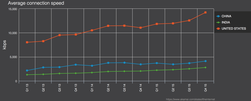 印度的平均网速在全球范围内处于中间偏后水平,为每秒 2.8Mb。平均网速最快的国家是韩国接近每秒 27Mb。中国平均网速为 4.1Mb,美国为 14.2Mb,日本为 17Mb。比如,以现在各国的平均网速下载一部高清电影,中国大约需要 20 分钟左右,韩国只需要 3 分钟,印度则需要 30 分钟。此外,印度家庭和工作场所较稳定,在途网速不稳定且慢一直饱受印度网民诟病。