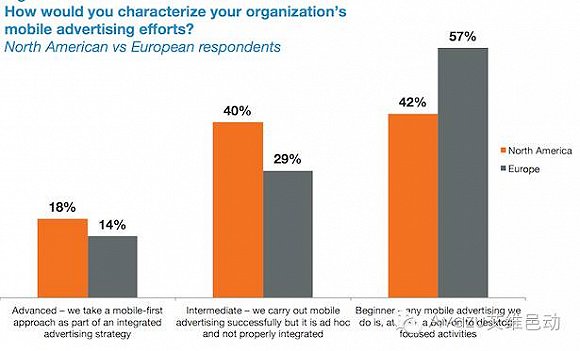 目前,大部分广告主仍处于移动广告行业的早期阶段,只有13%的广告主认为自己在移动广告领域具有先见之明,31%的广告主认为自己处于中间过渡状态,剩下56%的则认为自己是初学者,而北美(42%)这一百分比明显低于欧洲(57%)。但事实上,随着移动端渗透率的不断提升,营销人员应该把移动端作为他们整合营销活动的核心。