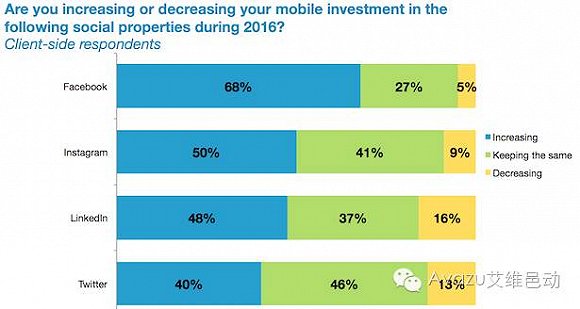 对于移动广告主来说,社交媒体是关注焦点,通过向社交媒体付费来了解受访公司是最常用的策略。超过三分之二的客户端受访者表示他们将增加今年在Facebook移动相关设备上的投资。