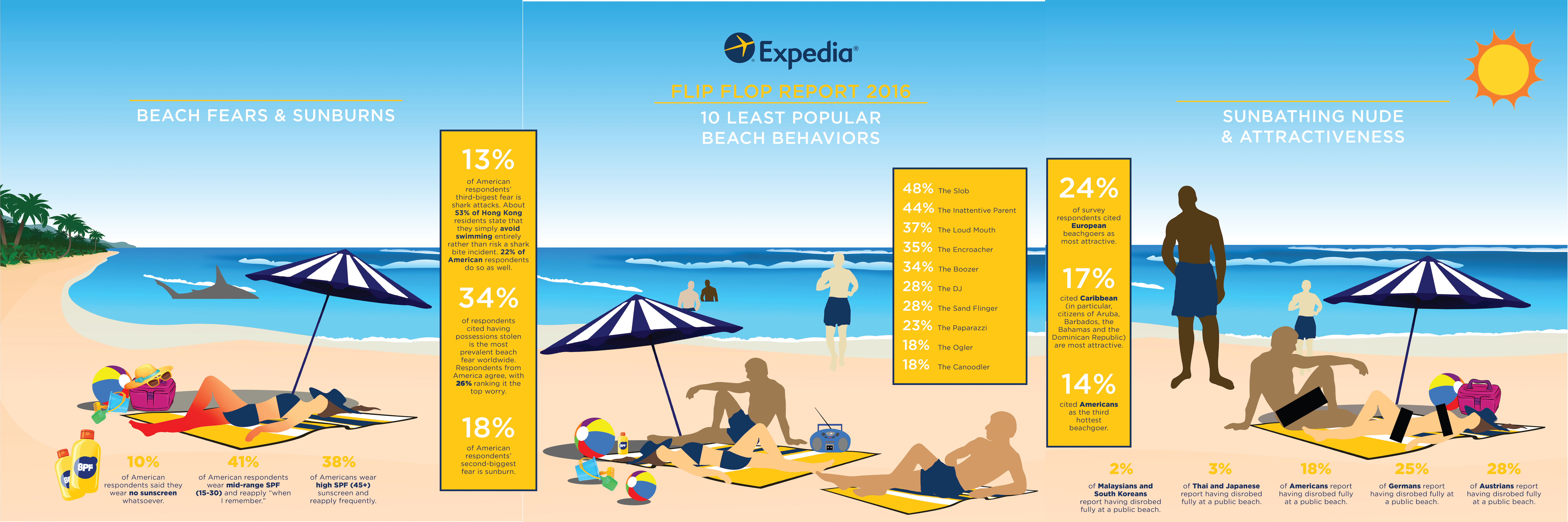 Expedia.com发布的2016年 Expedia Flip Flop报告,即对北美、南美、欧洲、亚洲、澳大利亚和新西兰游客的海滩度假行为的年度调查,由Expedia.com委托全球研究和咨询公司Northstar在线进行。参与这项研究的调查对象为来自世界24个国家和地区的11115位18岁以上的成年游客。这项研究还特别调查了哪个国家的游客最喜欢在海滩上进行全裸,哪种海滩上的行为最不合时宜和哪里能找到最迷人的海滩游客等有趣问题。