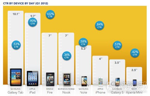 从总体上看,平板电脑广告点击率高于智能手机,但屏幕大小并非决定广告点击率的关键因素,例如10.1英寸的三星Galaxy Tab广告点击率为0.53%,而3.5英寸的Galaxy S广告点击率也是0.53%。