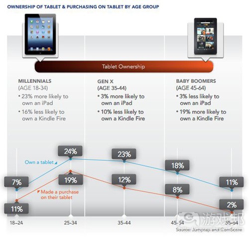 Jumptap还指出,iPad用户多集中于18-34岁群体,Kindle Fire用户则多为45-64岁群体。