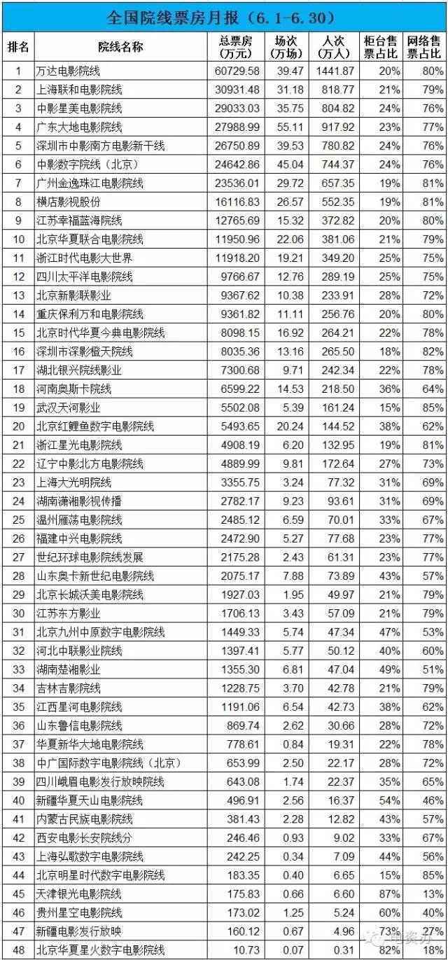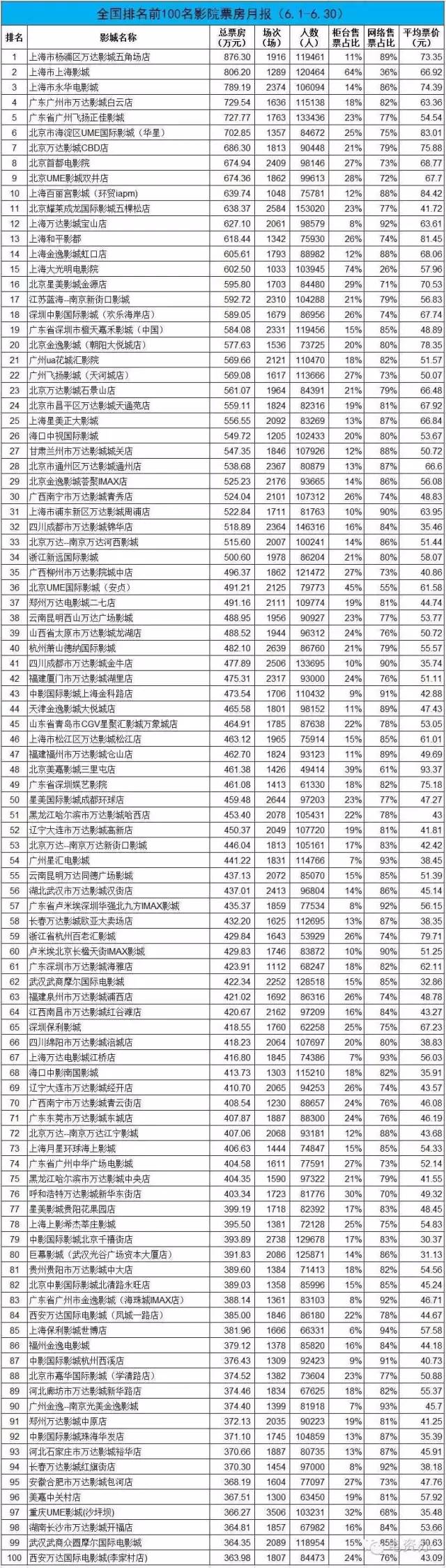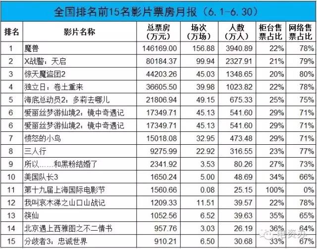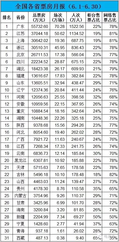 电资办:2016年6月全国电影票房月报 2016年6月全国电影票房月报,依据全国电影票务综合信息管理系统数据整理。本月全国票房38.63亿元,排场575万场,观影人次1.16亿。 更多阅读:电资办:2016年4月全国电影票房月报电资办:2016年5月全国电影票房月报电资办:2018年10月全国电影票房月报电资办:2018年12月全国电影票房月报电资办:2016年7月全国电影票房月报电资办:2018年10月全国电影票房月报电资办:2016年3月全国电影票房月报电资办:2021年11月全国电影票房月报电资办:2021年10月全国电影票房月报电资办:2021年8月全国电影票房月报电资办:2021年7月全国电影票房月报电资办:2016年7月18-24日全国电影票房周报电资办:2016年6月20-26日全国电影票房周报电资办:2016年6月13-19日全国电影票房周报电资办:2019年12月全国电影票房月报