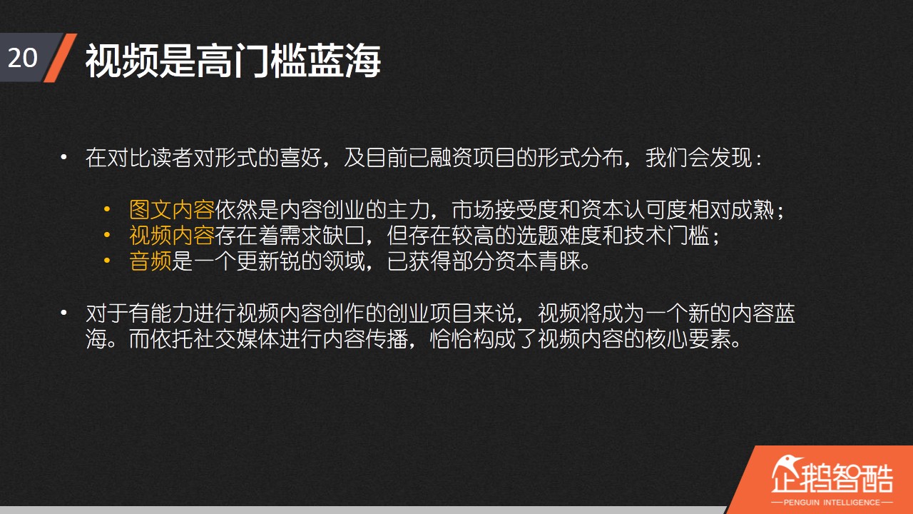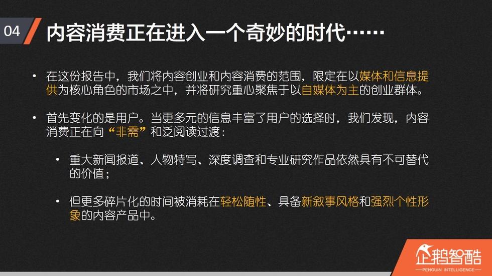 企鹅智酷:中国自媒体内容创业数据及趋势报告 更多阅读:企鹅智酷:2017自媒体趋势报告新榜:2018年内容创业年度报告企鹅智酷:用社交应用看新闻中年人胜过年轻人网易见外:自媒体行业现状研究与未来趋势分析报告TopKlout克劳锐:2017自媒体知识付费行业研究报告《自媒体人生存状态》调查报告:超60%月营收不足万元O2O下的自媒体社会化营销自媒体和自媒体读者进化史自媒体成功率低 传统媒体依然很强大企鹅智酷:中国三四五线城市网民时间&金钱消费数据报告企鹅智酷:2017中国直播行业趋势报告企鹅智酷:2017中国网络视频直播行业趋势报告自媒体再惹祸 被造谣筹款资金进入公司资金池水滴筹声明已报案北京市消费者协会:报告称超六成受访者曾被大数据“杀熟猎聘:2023届高校毕业生就业数据