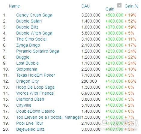 Zynga游戏《Bubble Safari》新增48万DAU,增幅为52%;PlayQ游戏《Bubble Blitz》位列第三,新增37万DAU,增幅为59%;另一款King.com游戏《Bubble Witch Saga》新增30万DAU,增幅为5%;EA游戏《模拟人生社交版》新增30万DAU,增幅为11%。