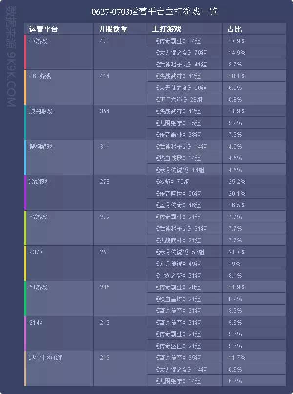 点评:本周9377调整《雷霆之怒》开服频率3服/天,开服占比8.1%。37游戏本周《武神赵子龙》日均开服频率调整为6服/天,开服总量稍有减少。主打游戏《传奇霸业》、《大天使之剑》均表现稳定。迅雷牛X页游再次挤入榜单,排名第十,主打游戏《蓝月传奇》本周开服频率增加至4服/天。