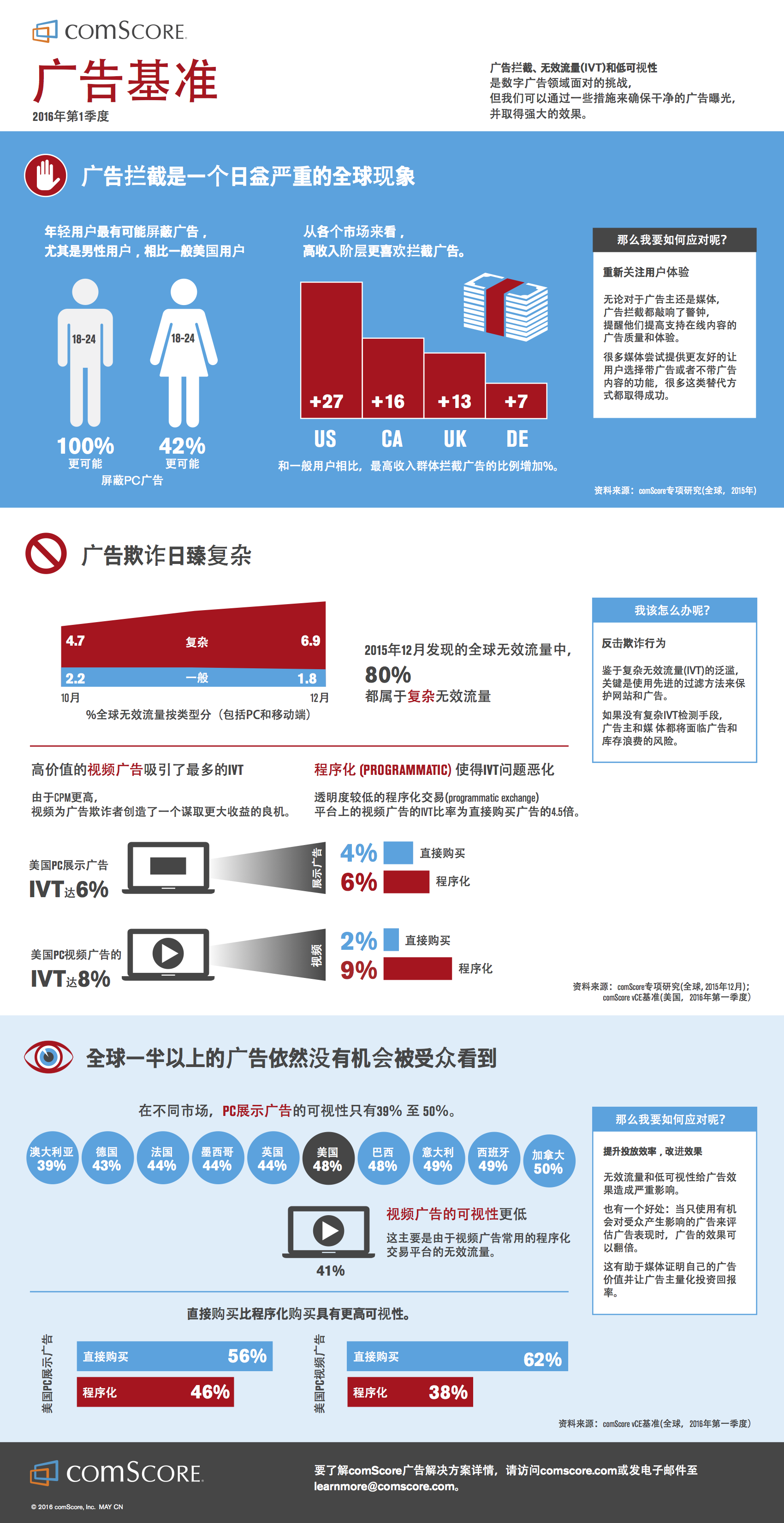 comScore:2016年第一季度广告基准-信息图 数字广告经历了强劲增长,目前尚未出现减缓的迹象,但为了维持全球繁荣,数字广告行业需要保证纯净的广告投放—— 这意味着广告能被消费者看到、避免欺诈行为。因为,看不到的广告没有任何效果。 这个信息图表显示了广告拦截、无效流量和可见度对全球广告投放的影响,广告行业可以通过哪些方式来应对这些挑战。 更多阅读:comScore:网络广告经济学,如何保证广告展示价值comScore:30%网络广告从未被观看comScore:2016年Q1广告拦截、无效流量和可视性调查comScore:从2016年Q1的数据看网络广告行业面临的挑战及对策Expedia Media:2014年1月、2月英国游客移动应用调查comScore:2015年广告主调查Comscore:2019年新闻内容发布行业前沿报告Comscore:2023年Z世代报告comScore:2022年音乐行业报告ComScore:2021年6月亚太地区旅游业快照Comscore:2021年3月英国旅游网站访客达3700万人comScore:新冠病毒推动新闻网站访问量增长comScore:2016美国聚焦未来的跨平台分析-社交媒体篇comScore:美国网民在访问互联网时一半时间使用的是智能手机Comscore:2019年亚太地区数字旅游发展态势