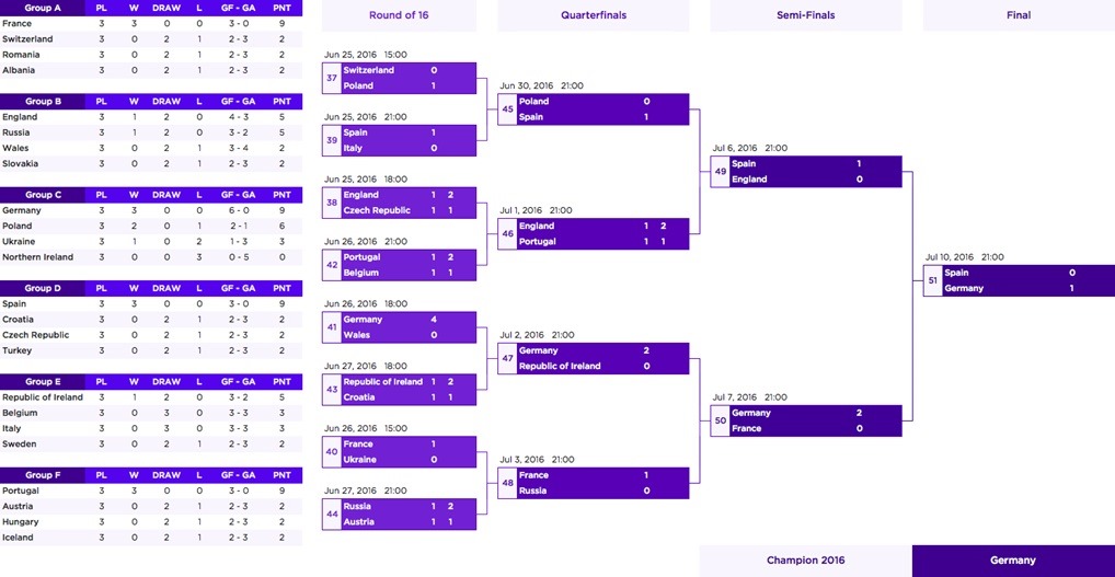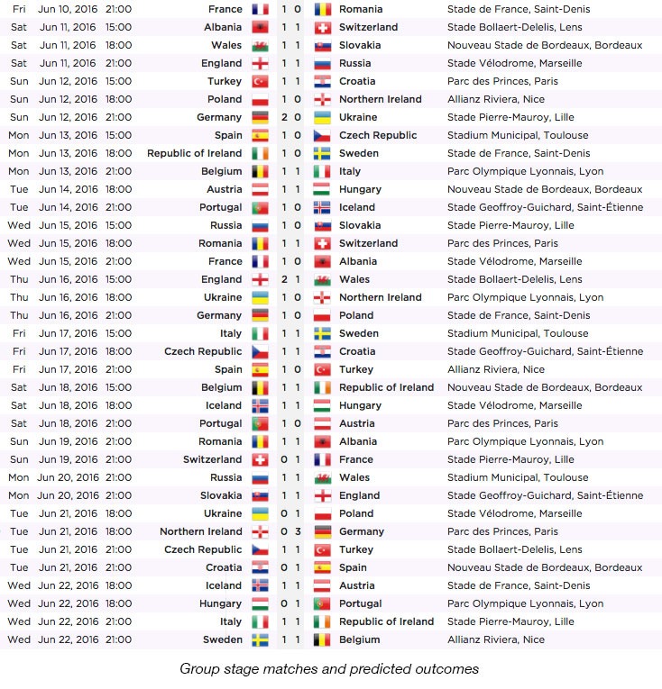 经过这些复杂的方法后,雅虎6月7日就已经发布了完整的欧洲杯大数据预测。德国最终1:0战胜卫冕冠军西班牙捧起德劳内杯。东道主法国队四强被德国淘汰出局,比分与两年前世界杯输球时一样——2:0。