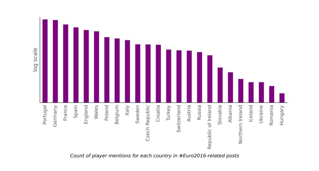 研究员们同时“分析”出最具人气球队。他们抓取了今年Tumblr前五个月的数据,主力挑选带有“欧洲杯”“足球”等标签的内容。得出180万条足球相关内容后,研究员再从中研究哪个国家、哪位球员被提及最多。葡萄牙成为最终大热。