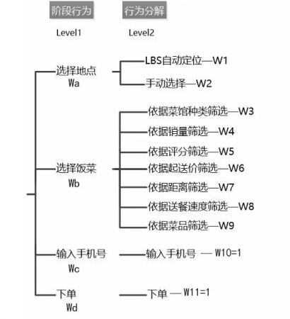 依据阶段行为与分解行为对于产品目标的重要性对分解行为的权重优先级进行层次分析(Analytic Hierarchy Process)评估,求得各行为的相对重要性W(注意:当该层次只有一个分解力时,不存在比对,因此相对权重为1)将阶段行为的相对权重与分解行为权重相乘即可得到最终权重值(如依据菜馆种类筛选的重要性程度为:Wb×W3),即该分解力的重要性程度。