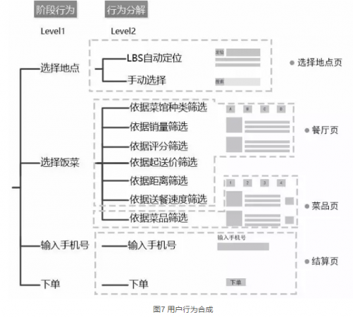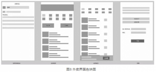 依据合成行为的发生时间进行页面排序,依据前面分解行为的权重值在合成行为界面上进行布局,一级任务一级展现,二级任务二级展现(类似于力学中动态平衡条件约束),具体来说,从左上至右下直线逻辑,最重要在左上,最不重要右下。最终可以得出该产品的大致原型,即解出了”美食外卖产品界面“,如图8所示。