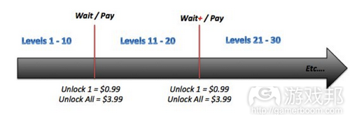 游戏X是款谜题游戏,玩家需要通过各种关卡。关卡被制作成关卡包,每个关卡包有10个关卡。为限制前进过程,你需要添加定时机制,这样每当玩家完成一个关卡包时,他们就需要等待特定时间,方能继续探险。玩家可以通过购买单个解锁内容(它会解锁下个关卡包,其中包含10个关卡),或是投入更多资金,解锁所有关卡包(100个关卡),跳过等待时间。完成各关卡包之后的等待时间会越来越久,这让付费购买所有关卡解锁包变得越来越诱人。