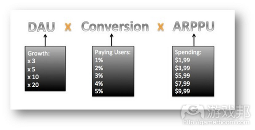付费用户数量因游戏而异,通常游走在1%-5%之间。我之所以让你特别留意DAU是因为,只有用户富有粘性,你才有可能促使他们发生转换。在将玩家由免费用户转换成付费用户时,你需要避免采取过快步伐,急于实现留存率最大化,进而获得长期转换率。这样,你就不会出现牺牲未来粘性换取当前收益的情况。