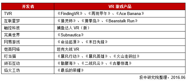 中国游戏厂商在VR游戏内容研发方面尚处于初期试水阶段,大中型上市游戏企业偏向于通过投资、合作、平台搭建的方式布局VR,而非直接参与内容研发。而目前已经曝光或推出的VR游戏产品也大多从手机或PC游戏移植而来,专门针对VR平台开发的游戏产品极少。
