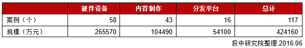另外,在2015年,从案例数量上来说,硬件设备方面投资占比为53%,内容制作为36%,分发平台为11%。而2016年上半年,硬件设备方面投资占比已降至29%,内容制作和分发平台分别上升至50%和21%;从投资规模上来看,硬件设备同样从去年的71占比减少到今年上半年的50%,而内容制作从16上升至37%,分发平台变化不大。