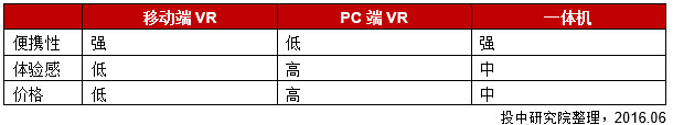 目前国内VR硬件投资市场以输出设备为主,市场上主要产品可以分为移动端VR、PC端VR和一体机。