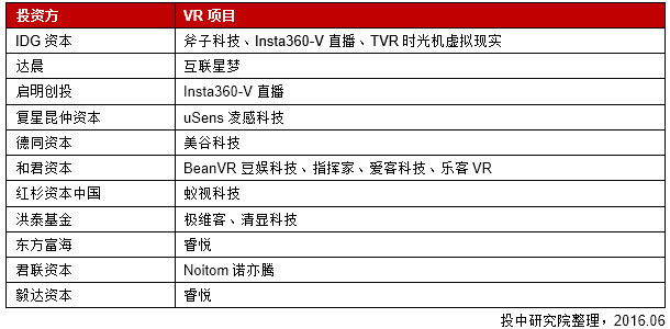 根据投中研究院调研显示,目前多数投资机构在积极关注VR领域的投资机会,但并不会作为主要投资方向。虽然在VR领域VC/PE机构投资规模较少,但是游戏、直播、影视等方面机构投资案例很多。目前多数VR公司同时也是游戏、影视公司,实际仍会有很多资本流入。