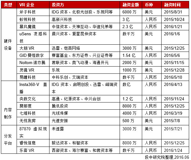 投中研究院认为,在国内整个VR领域的初创阶段,上市公司的雄厚资本对VR行业的发展至关重要。VR的基础研究以及内容开发和分发都需要大量的资本作为支撑,上市公司对VR领域的投资是提高公司自身和VR行业的关键动力。