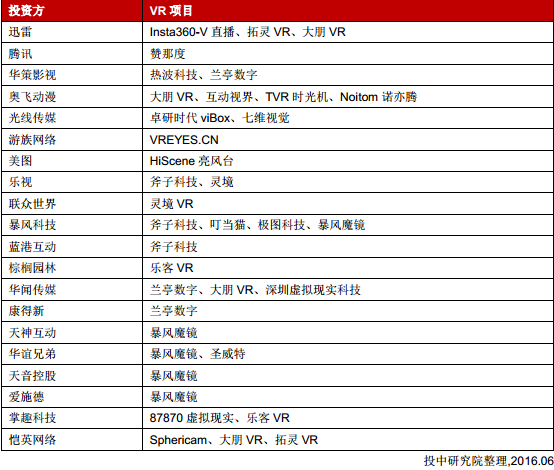 2016年,VR行业的火热引发了众多上市公司对这一领域的强烈关注和投资热情,阿里巴巴、腾讯、百度、小米、乐视等巨头纷纷进入VR领域。2016年1月,暴风魔镜获得第二轮融资2.3亿元人民币,天神互动、暴风科技、华谊兄弟、天音控股、爱施德等上市公司均有投资;2016年2月,奥飞动漫投资虚拟现实游戏公司TVR和全景视觉公司互动视界;3月华策影视投资国内顶级VR/AR影像内容&VR直播制作公司兰亭数字1470万元人民币,接着继续投资了业内知名VR内容供应商热播科技640万元人民币;4月,迅雷作为领头方参与国内最大的360°全景相机制造商Insta360的B轮融资;5月,棕榈园林和掌趣科技共同参与了国内VR娱乐领军企业—乐客VR的A+轮融资。短短半年时间内,游戏、建筑、影视等各领域上市公司均在积极布局VR行业,VR热度得到进一步提升。