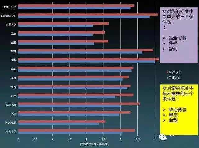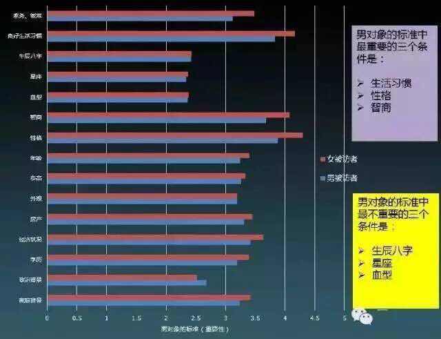 女选男:最看重生活习惯、性格、智商;最不看重生辰八字、星座和血型。