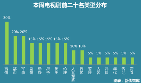 电视剧题材与上周相比变化不大,言情(注:涉及多个题材,则重复录入)类型保持30%的比例,居高不下;剧情、战争和人文军旅题材都有所下降;都市题材的电视剧增多,除了《欢乐颂》和新增了《小丈夫》和《守婚如玉》两部电视剧。