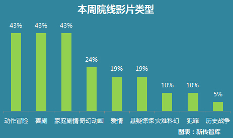 7月9日-7月15日,共计7天档期内上映影片21部(包括前期已上映但仍在本周热映的影片),其中国产片17部,占比81%,进口片4部,占比19%,较上周下降8个百分点。影片类型也体现出明显的“中国特色”——动作、喜剧、剧情片三分天下,都是国产片成熟可驾驭的内容。动画、悬疑、灾难、科幻等大幅缩水。