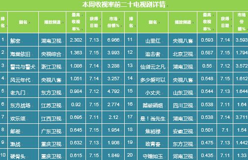 与上周相比,本周上榜电视剧收视率整体有明显的上升,平均收视从上周的0.734%升至0.780%。其中,湖南卫视《解密》的收视率在本周节节攀升,一周内四天破2%,最高收视2.302%,但是在周五收视却大幅度下降,跌到1.2%左右。《解密》、《海棠依旧》和《警花与警犬》分占前三,而《硬骨头》、《山里红》、《多少爱可以重来》等在开播之初迅速重进榜单,尤其是《硬骨头》排名10位,潜力巨大,下周收视率或会继续上升。