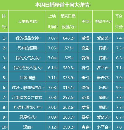 网络大电影在近半个月来略显颓势,与上周相比,本周上榜的十部网络大电影的平均日播放量有明显下降,从上周平均每天每部458.19万次播放到本周的385.95万次播放,最高播放量也从742.1万次下降到643.2万次。