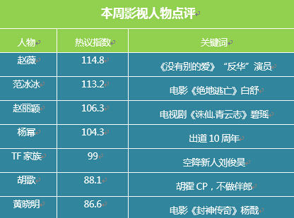 本周娱乐圈“赵薇事件”引爆舆论,赵薇电影《没有别的爱》因启用陷台独争议演员戴立忍和辱华争议演员水原希子而遭到网友的口诛笔伐,在舆论风暴下该剧组及演员纷纷发表声明,并撤换相关演员;其他电影演员范冰冰、赵丽颖、黄晓明皆因参演作品的新动态受到关注;话题度一直很高的杨幂本周迎来出道十周年纪念,与粉丝大量互动,一时间热度非凡;“小鲜肉”“TF家族”迎来新“爱豆”刘俊昊但没有得到粉丝认同;“老干部”霍建华大婚,挚友胡歌却因不做伴郎引得网友善意“叹息”。