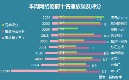 与上周相比,本周上榜网剧的平均评分不相上下,都在6分左右,《半妖倾城》和《怒江之战》依旧保持了低评分。此外,大部分网剧的平台评分在本周都有轻微下降,如《老九门》从8.7分下降到8.5分,《六扇门》也从6.7分下降到6.5分。而新上榜的两部“偶像剧”豆瓣评分也差距明显,由TFboys担当主角的《超少年密码》豆瓣评分不过中规中矩的5.2分,但是由杨洋主演的《我是你的咩咩phone》豆瓣评分却高达9.3分,超越了之前口碑甚好的《最好的我们》和《余罪》。