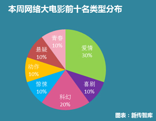 与上周相比,本周网络大电影在类型方面有所增添,除了爱情、动作、科幻、恐怖的类型外,还新加了青春、悬疑和喜剧的类型。另外,爱情题材的电影已经有明显的减少,所占比例从上周的60%急剧下降到30%。而播放平台方面,本周爱奇艺凭借《我的极品女神》一举超过腾讯视频,拿下冠军。