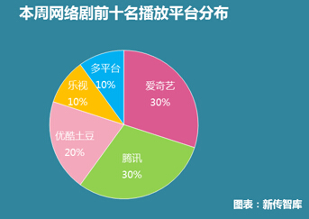 本周网剧的播出平台依旧是爱奇艺、腾讯视频和优酷土豆“三分天下”,其中爱奇艺和腾讯视频虽然从量上看势均力敌,但是综合排名分布来看,爱奇艺略胜一筹。在榜单前三部网剧中,爱奇艺就包揽了2部,且长期占据榜首,实力不容小觑。