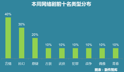 本周统计日播放量前十的网络剧中,题材还是言情(注:涉及多个题材,则重复录入)占“半壁江山”,其中《执念师2》和《 终极一班4》还将科幻元素和言情元素进行了巧妙结合。与上周相比,本周青春题材的网剧所占比例有明显下降,科幻元素则有所上升。目前题材类型虽然较为多元,但是军事题材、家庭伦理题材和现代都市题材等鲜少涉及,在这些方面网剧还有很大的空间。