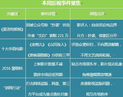 去年已经上映的影片却依旧话题不断,票房黑马《夏洛特烦恼》与影评人因“抄袭说”对簿公堂,双方互不妥协,最终裁决尚未出炉。电影《老炮儿》在十大华语电影的评选中拔打头筹,评选结果公平合理,获广泛好评。而反观今年电影,暑期档走低的现状却令人担忧。影视行业的一个利好消息是:打击盗版的“剑网行动”将有利地保障影视版权。