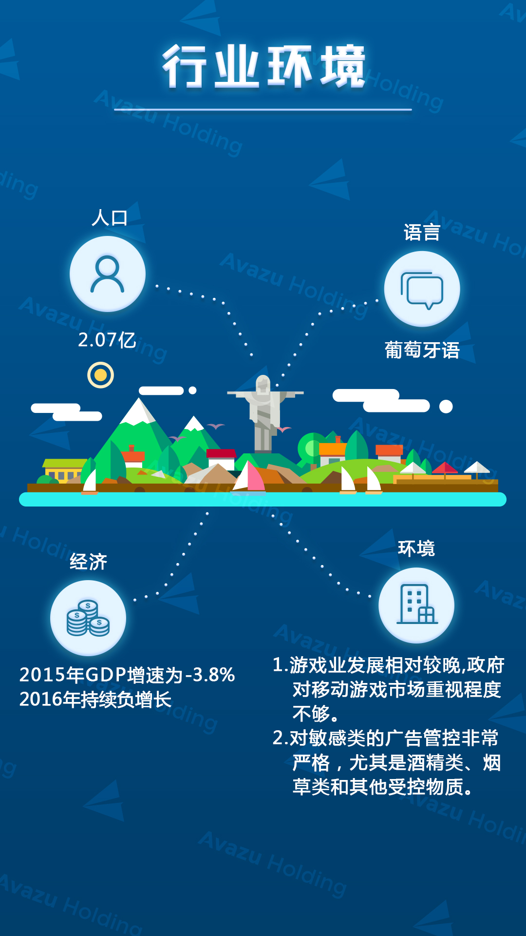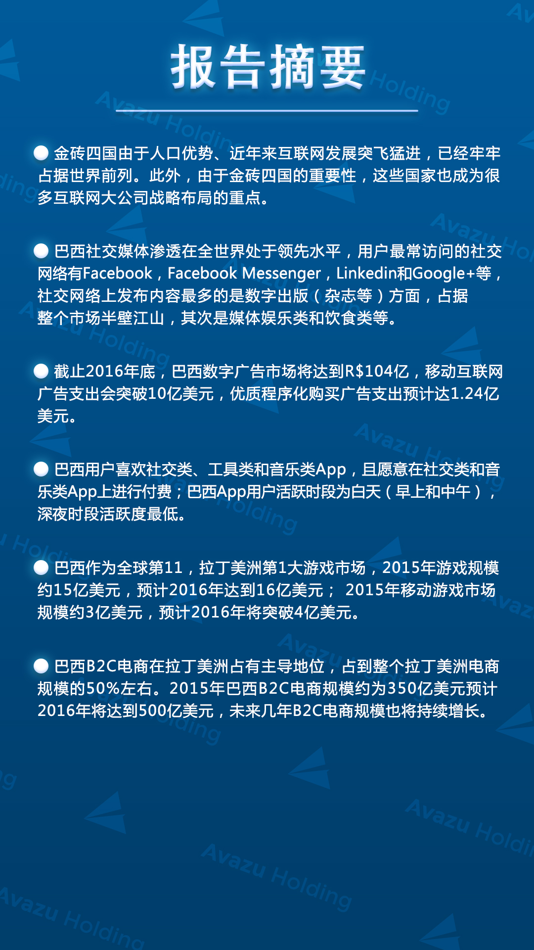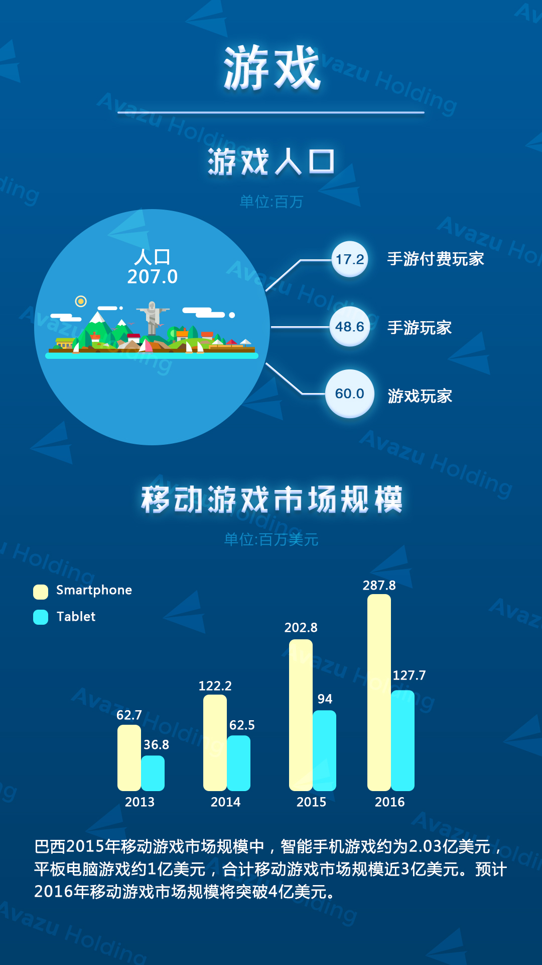 近期,技术驱动的跨国互联网控股集团Avazu Holding从游戏、广告、电商、App市场等方面,对巴西互联网产业进行了相关研究分析,巴西作为金砖四国之一,是全球第11,拉丁美洲第1大游戏市场,据Newzoo预测,巴西2015年游戏规模约15亿美金,