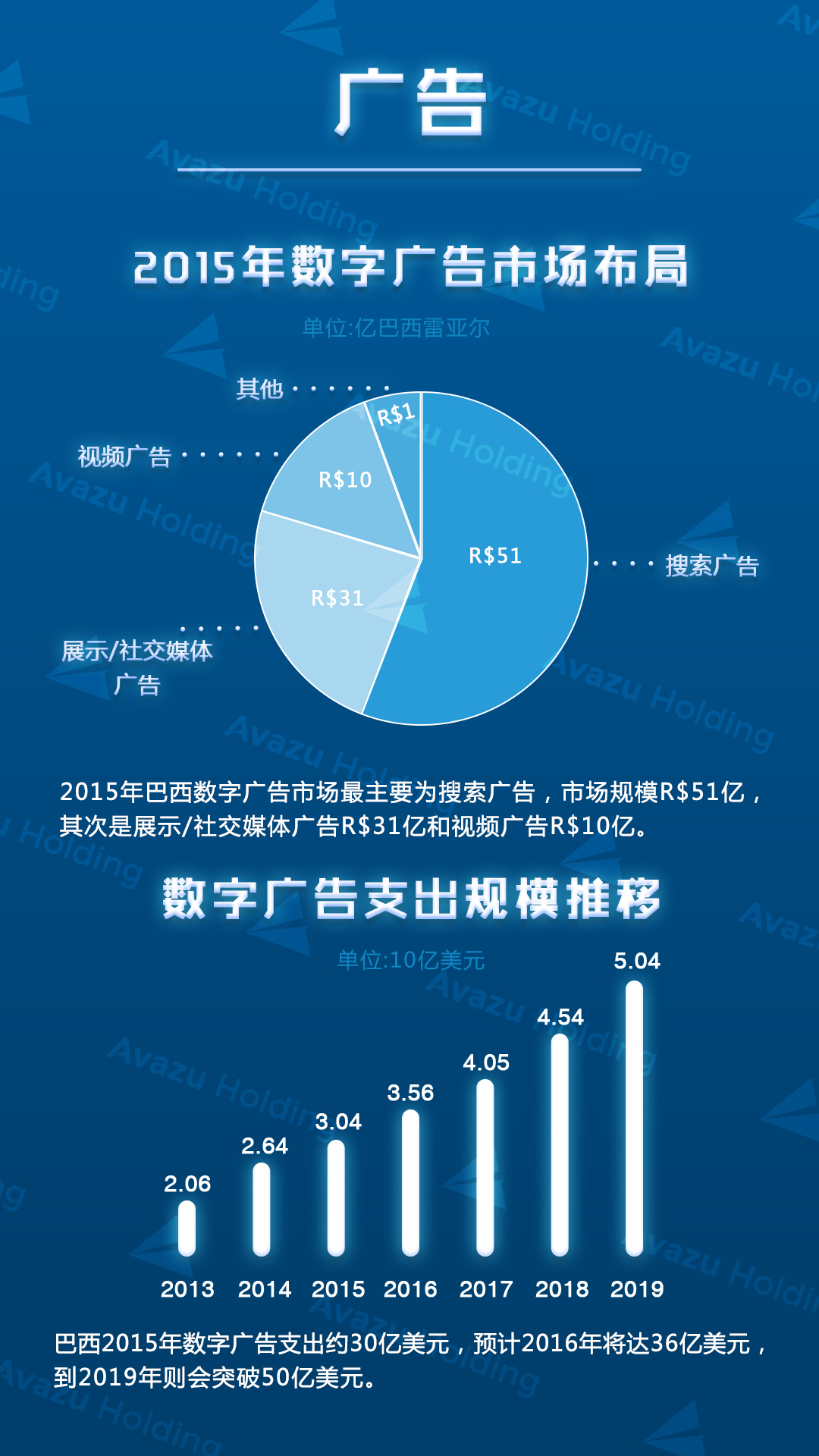预计2016年将达到16亿美元;同时,巴西也是拉丁美洲最大的广告市场,根据IAB巴西预测,截止2016年底,巴西数字广告市场将达到104亿巴西雷亚尔(约32亿美元),相比2015年的93亿雷亚尔(约28亿美元),年增长率将达12%。