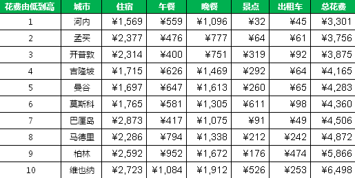1、住宿:3晚住宿花费最低的三个城市分别是河内(1569元)、曼谷(1697元)和吉隆坡(1715元);而住宿花费最高的则是纽约(7352元)、坎昆(6564元)和伦敦(5341元),平均约为最便宜城市的4倍。
