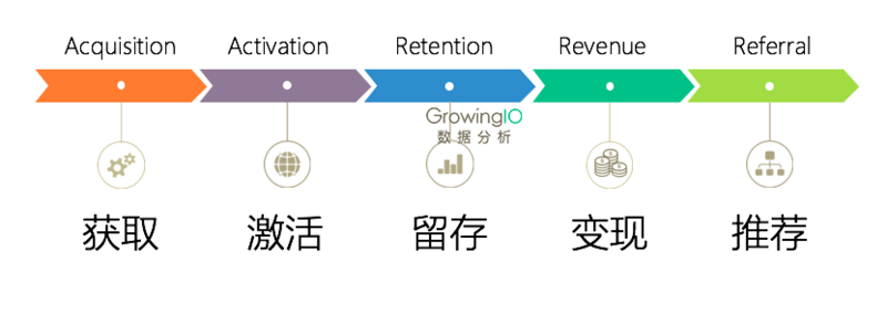 现在流行的海盗法则“AARRR”模型则将 “ Growth Hacker ”落地成五个可以执行的步骤,分别是:获取用户(Acquisition)、激活用户(Activation)、用户留存(Retention)、用户变现(Revenue)和推荐传播(Referal)。