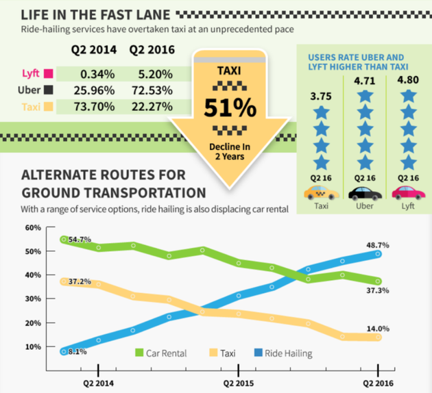 整体而言,专车服务成为美国商务旅行者偏爱的陆地出行方式,进一步凸显了出租车等传统出行方式面临的困境。事实上,自2014年以来,全美出租车客流量已经减少51%。
