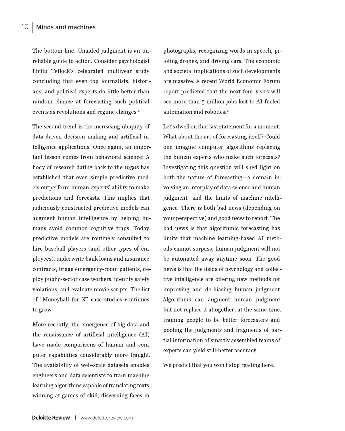 那么,预测本身会怎么样?会有一天,计算机算法会代替做预测的这些专家吗?研究这一问题要聚焦于预测的两个本质——数据科学和人类判断,并且,二者是相互作用的,此外,还要关注机器智能的局限。